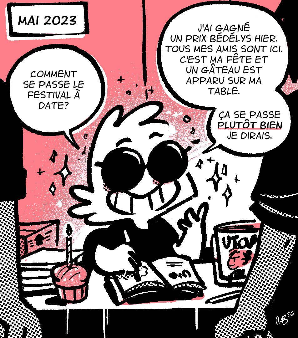 Le Festival de BD de Montréal est en grande campagne de financement et pour l’occasion, ils ont lancé un encan contenant un paquet d’items, dont beaucoup de belles planches et dessins originaux d’auteurs comme Michel Rabagliati, Julien Paré-Sorel, Julie Doucet, Julie Rocheleau et plus encore . J’ai donné une planche de Utown ainsi que le dessin original de la couverture; normalement, je ne l’aurais jamais vendue à un particulier, mais la cause en valait la peine. L’encan se termine le 3 mai, c’est donc le temps de miser maintenant, pour soutenir un festival désormais indispensable. Le Festival m’a demandé de faire un p’tit dessin pour accompagner leurs comms et ce moment de 2023 m’est revenu en tête.