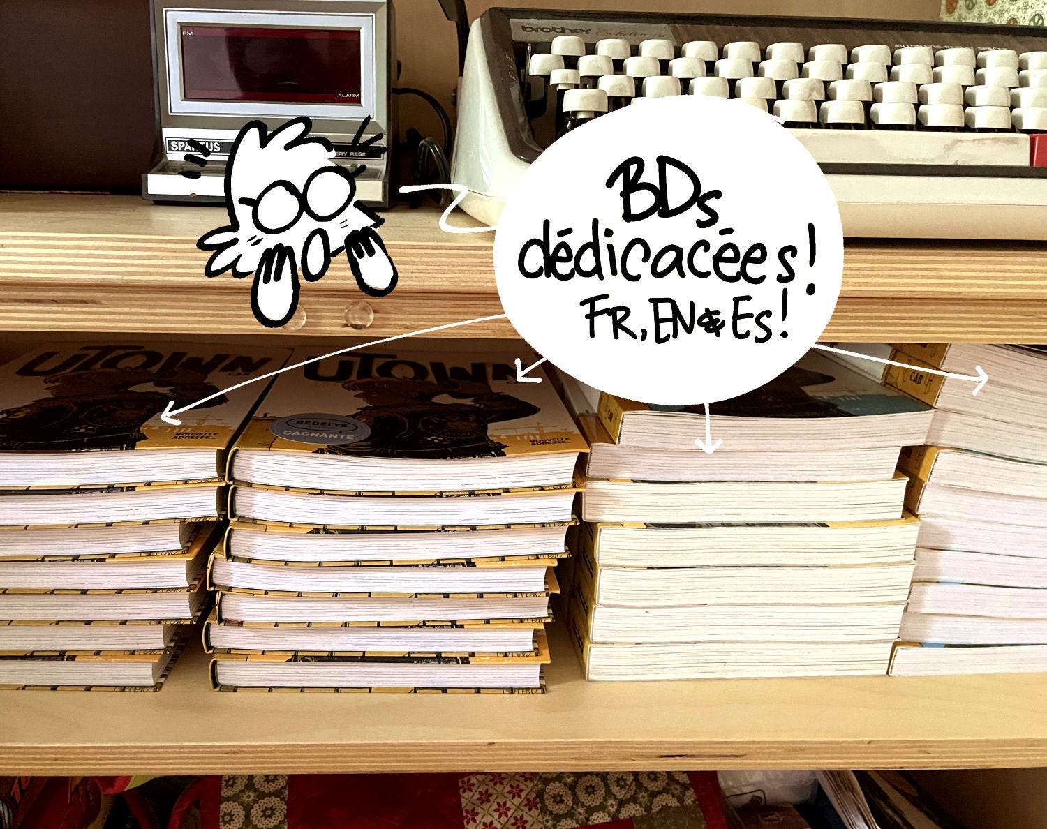 Prints, livres dédicacés, BDs en français, anglais ou espagnol, art books, y’a de tout dans ma boutique. C’est quand même intense quitter l’appartement où j’ai fait la plupart de mes projets de BDs. Toute forme de support est vraiment appréciée :)
