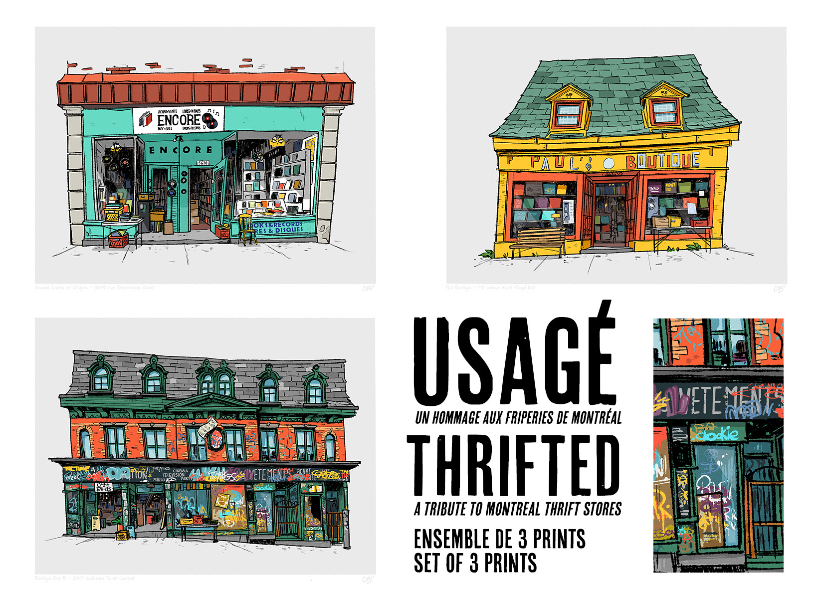 It had been a while since I had drawn a Montreal storefront. For a while. I wanted to draw Wilensky’s little corner entrance but I’ve done my share of restaurants. Then, while passing in front of the little yellow house that is home to Paul Boutique, I had a flash: thrift stores! I love thrift stores and second-hand stores! And if I was gonna draw a series, I had no choice: the massive Eva B building was going to be part of it. This is by far the most ambitious storefront illustration I have done to date and I love the result. And with that, I think I'm done doing prints for the rest of the year.