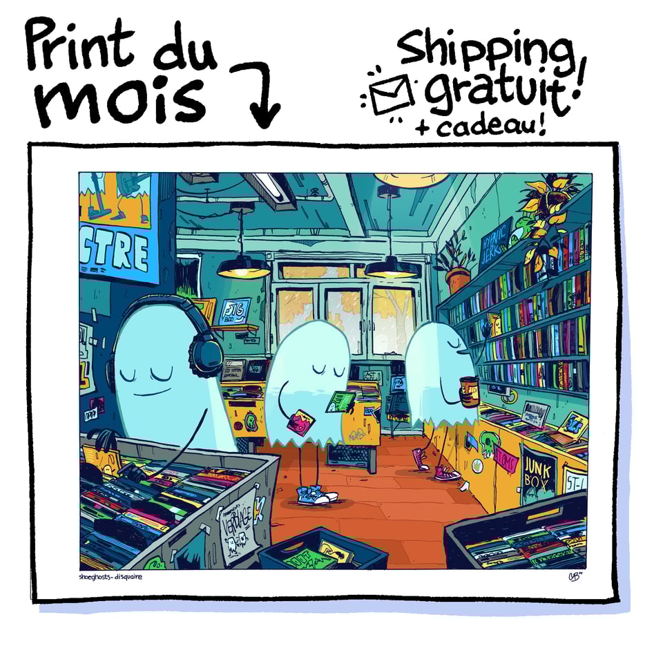 It’s the return of the Print of the Month! To celebrate my love of music stores, I’m featuring Shop Ghosts, the third and final illustration in my Shoeghost series.