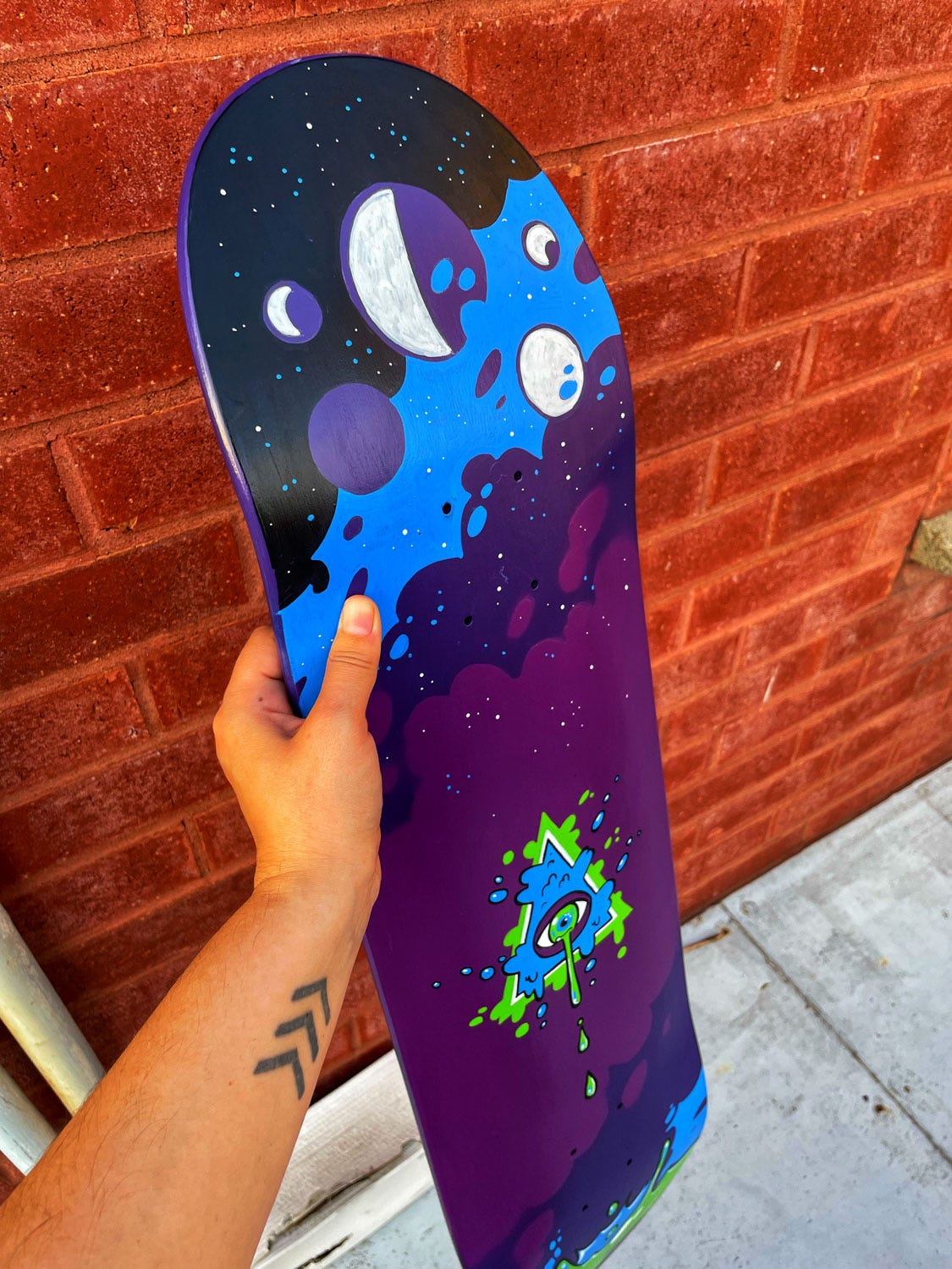 Confession time: I was always too wimpy to skateboard, even though I was fascinated by the skate culture. My girlfriend got back into it last year and I get to live my best skatepark poser life. When she mentioned wanting to change boards, I offered to design and paint one for her. We worked on a design, I checked out tutorials, and took a leap of faith using spray paint and Poscas. It was FUN! Each step was more satisfying than the last. If you want to get out of a creative block, I have one tip for you: make a gift. It's easier to get your head out of your ass when you're working for someone you care about, and it brings a sense of pride that's pretty hard to beat. All stages of creation, from the first sketch to the final psychedelic-space skateboard are on Patreon!