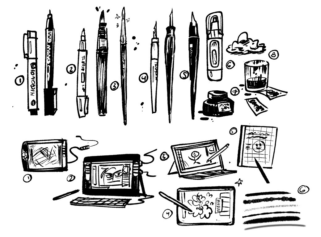 In March, I gave a dense workshop on inking and tools, in Chicoutimi. It was my first time putting together a class since my very stressful, very challenging (pandemic) year as a Color Theory/Digital art teacher. To illustrate the different kinds of inking tools, I made this!