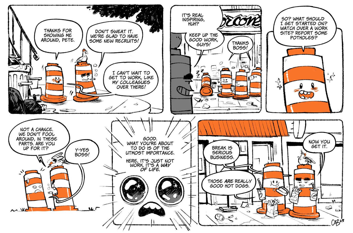 Ponto, our own famous sentient construction cone, made a call for guest comics and I responded with this. I never miss an opportunity to talk about the Pataterie--and the cutest mascot around.