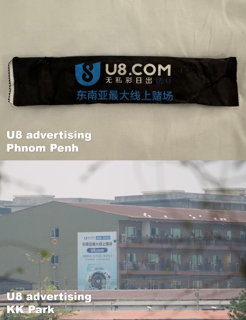 Speaking of Cambodia, how’s this for a strange dining experience? Before departing for Thailand, I went to grab take-out in Phnom Penh’s Chinese business district. My noodles came with a cutlery set wrapped in an advertisement for “U8” – an online gambling outfit that bills itself as “Southeast Asia’s largest online casino.” A few days later, as I peeked through the woods surrounding KK Park, I saw U8 advertisements plastered all over its walls. Video footage from The Reporters’ recent visit to KK Park featured even more U8 ads, which raises an obvious question: What exactly is U8 and why does it advertise so heavily inside KK Park? If you have any insights to share, please reach out.