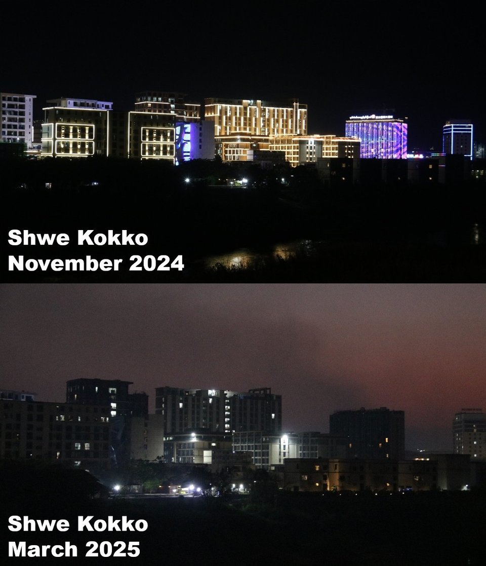 Shwe Kokko is one of the most stunning sights in the region. It’s a newly-built city on the Myanmar side of the Moei River that leaps out of nowhere as you drive past sugarcane fields on the Thai side. Many of the buildings inside house scamming operations, and at night they used to light up like misplaced Las Vegas. But after the recent power cut, the lights are noticeably dimmer.