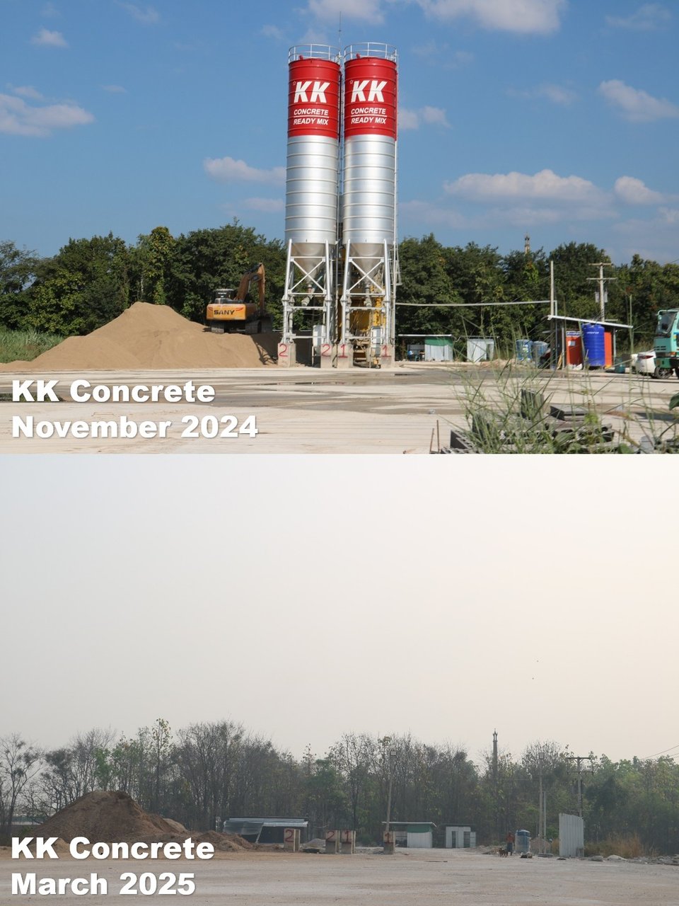 Concrete mixers were a constant presence on the roads leading to the Moei River during our November trip. There were fewer of them this time around, perhaps because a large concrete mixing plant called “KK Concrete” was gone. It looked like it had moved to a new location across the river. Another supplier was instead shipping cement powder to KK Park via a dedicated ferry crossing on the Moei River, which continued to operate uninterrupted.