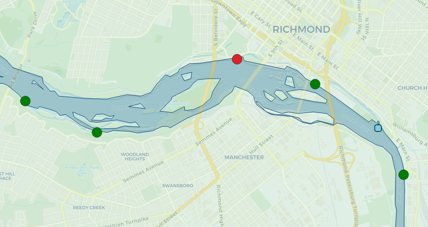 Here are the current river conditions for the James. The rope swing at Tredegar is labeled high caution for E-coli, but the rest of the spots look good.