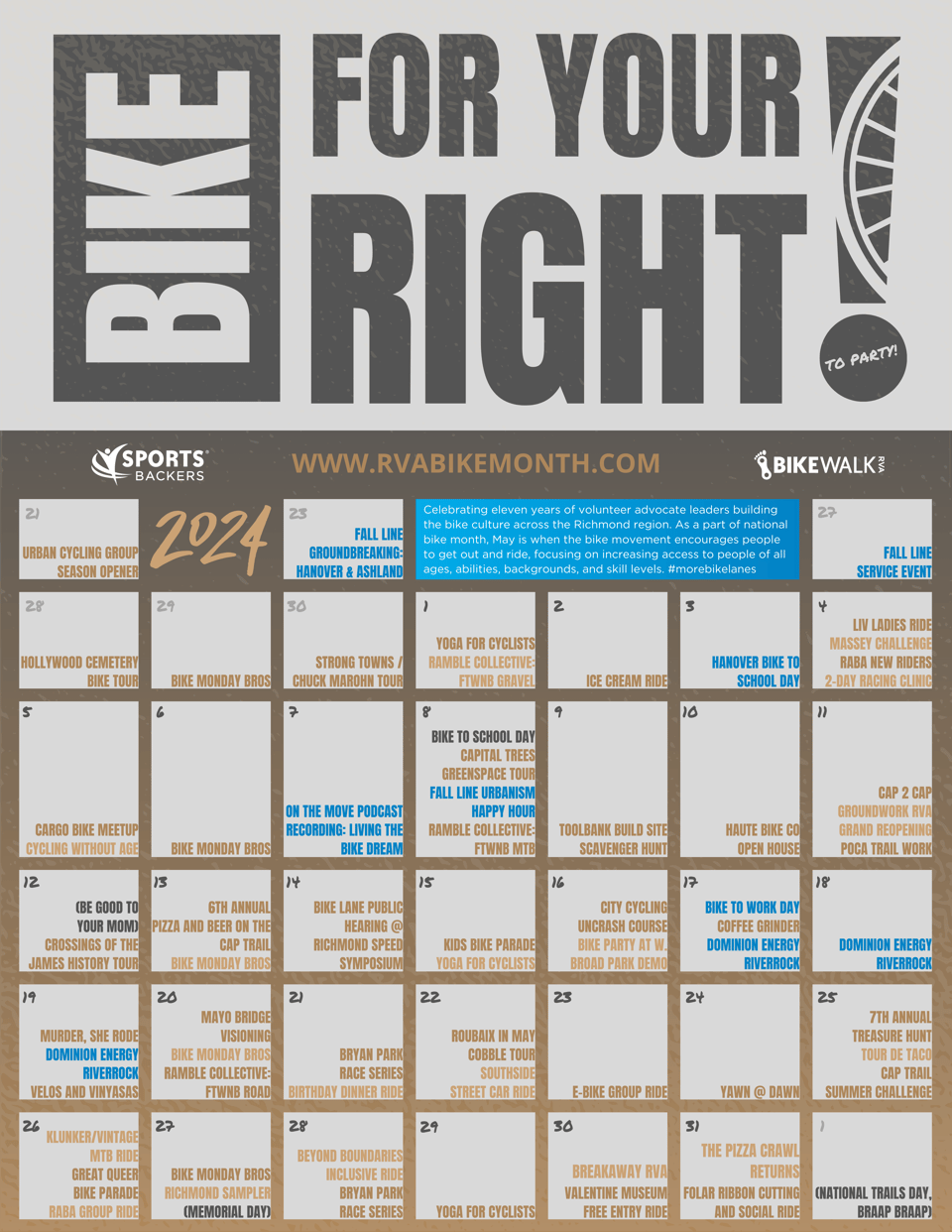 - Today marks the beginning of National Bike Month. Check out this calendar of events from Sportsbackers