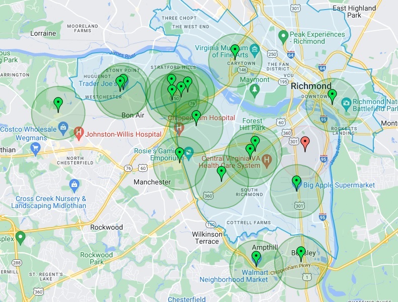 South Richmond News has a neat map of grocery store locations on Southside, with a 1-mile radius surrounding each store.
