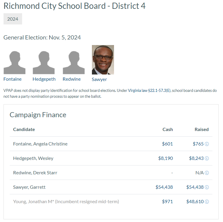 He is running against three other candidates including Garret Sawyer who was selected as the interim member after Jonathon Young resigned. Here is the fundraising so far of the declared candidates: