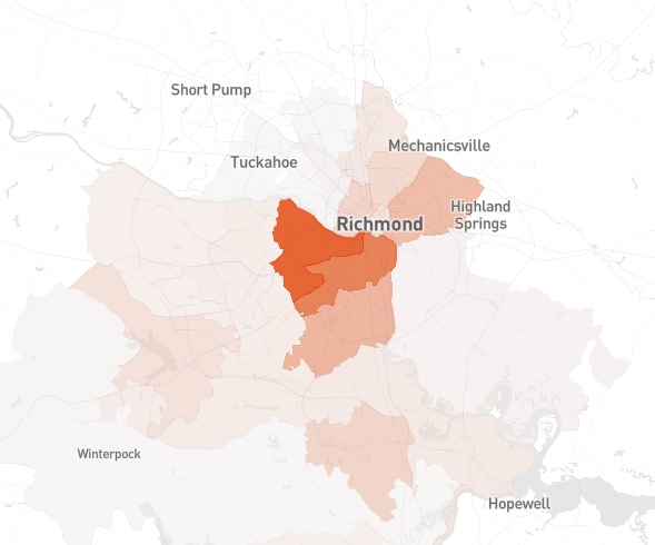 Below is a map of Richmond and Chesterfield indicating the number of evictions filed in various parts of the city and county in the past year.