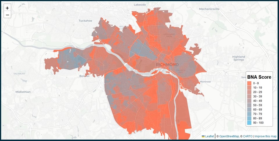 Below is a neat map of Richmond using the People For Bikes BNA tool.