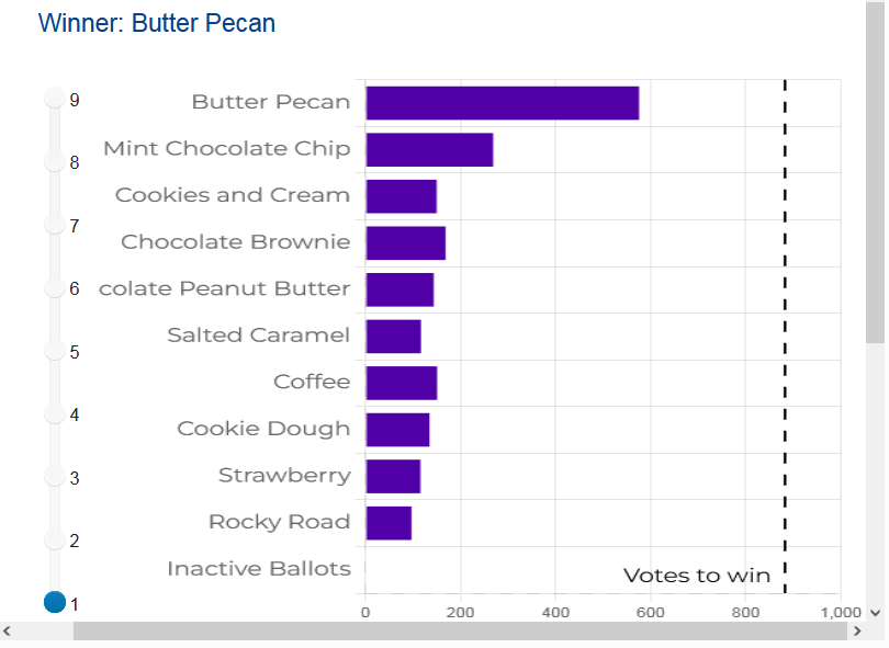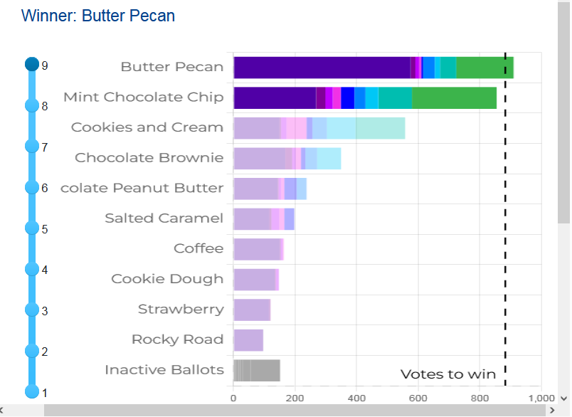 In this particular example, Butter Pecan would have barely defeated Mint Chocolate Chip in the final round, but notice how many voters preferred other flavors.