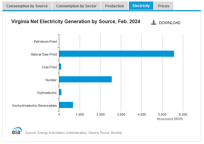 One issue with electric vehicles regarding emissions is the source of the energy generation. Here is a chart of Virginia’s electricity sources:
