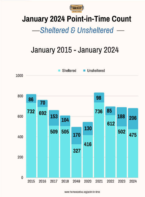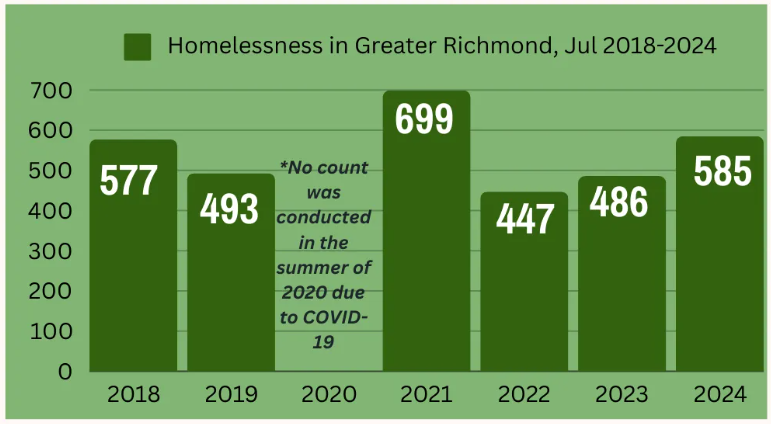 Homeward, a planning and coordinating organization for homeless services in the greater Richmond region, reported 585 people experiencing homelessness in the area.