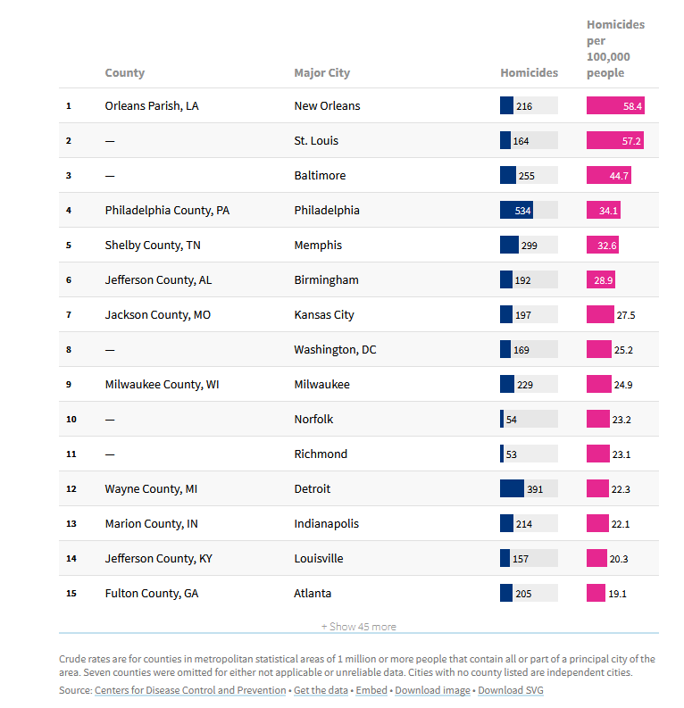 Richmond ranks 11th, with a rate of 23.1 homicides per 100k population. The overall average in the United States is 10.5 per 100k.