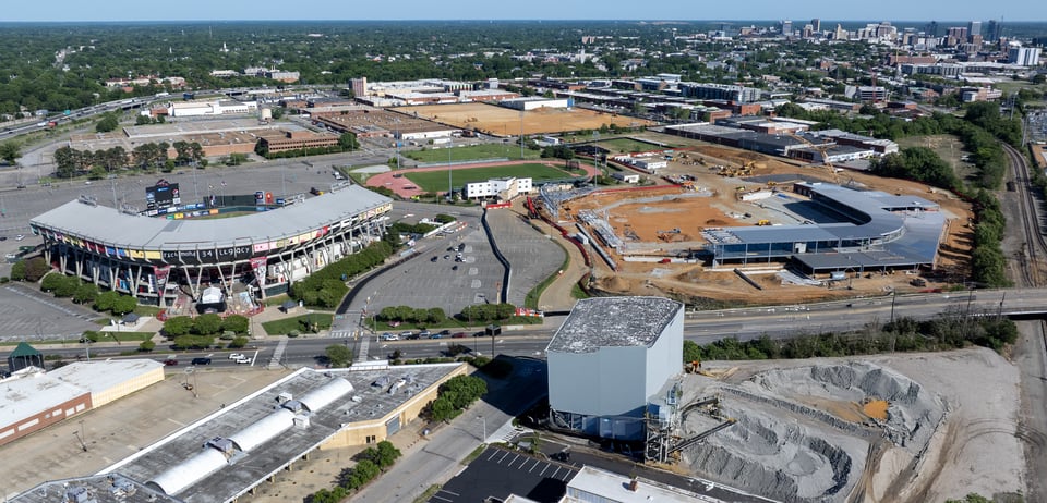 Redditor CarlCasper shared this photo of the two stadiums, but didn’t like the apartment building across the street so he added an AI-generated rock quarry instead.