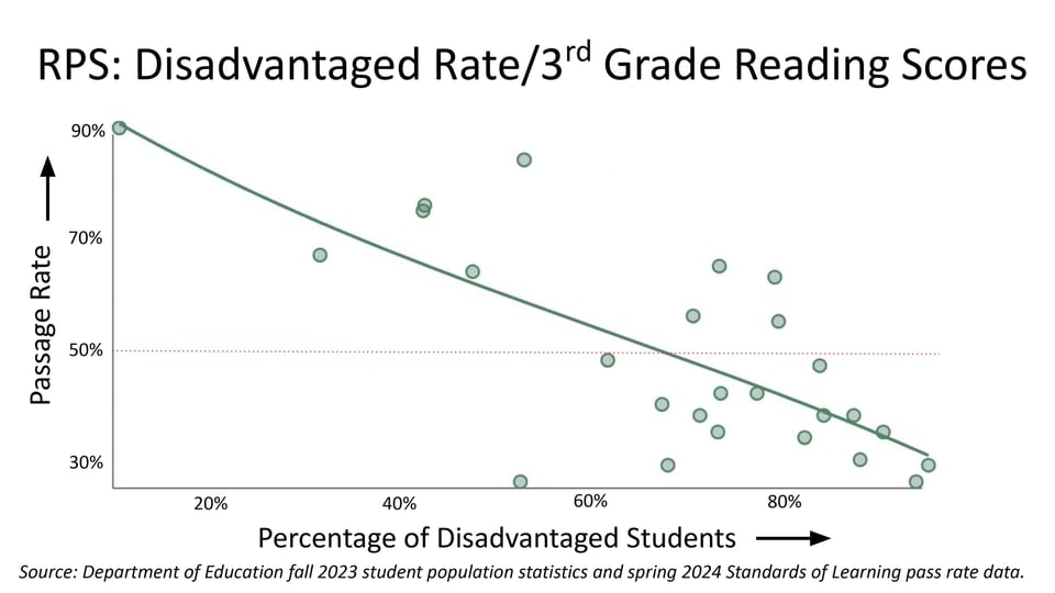 The entire article is absolutely worth a read, but one particular graphic was striking, the negative correlation between 3rd grading reading scores and the percentage of economically disadvantaged students in RPS schools: