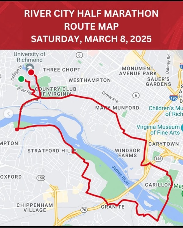 The Richmond City half-marathon and 10k takes place tomorrow morning, beginning and ending at the University of Richmond campus and traversing Huguenot and Nickel Bridge.