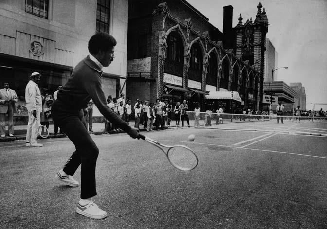 Richmond Mayor Marsh playing tennis on N. 6th Street in the summer of 1977.