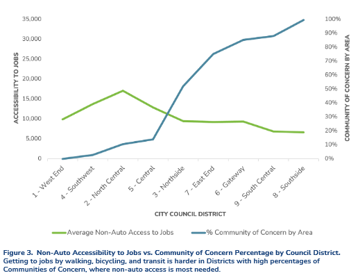 The Department of Public Works held their Street Safety Symposium Tuesday evening. Here is the action plan for 2024, ‘Richmond Connects’. This chart from the plan compares city districts by non-auto access to jobs and communities where non-auto access to jobs is most needed: