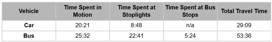 Notice that though the bus is slower in each of the three categories, the most dramatic difference is the extra 13:53 the bus spent waiting at traffic signals. This isn’t to say that the bus spent more time at any given traffic signal, but rather that the bus was stopped by more traffic signals. Of the 51 signals (by my count) that exist along the 14’s route, the bus had to stop at 26 of them whereas the car was only stopped by 15 total lights.