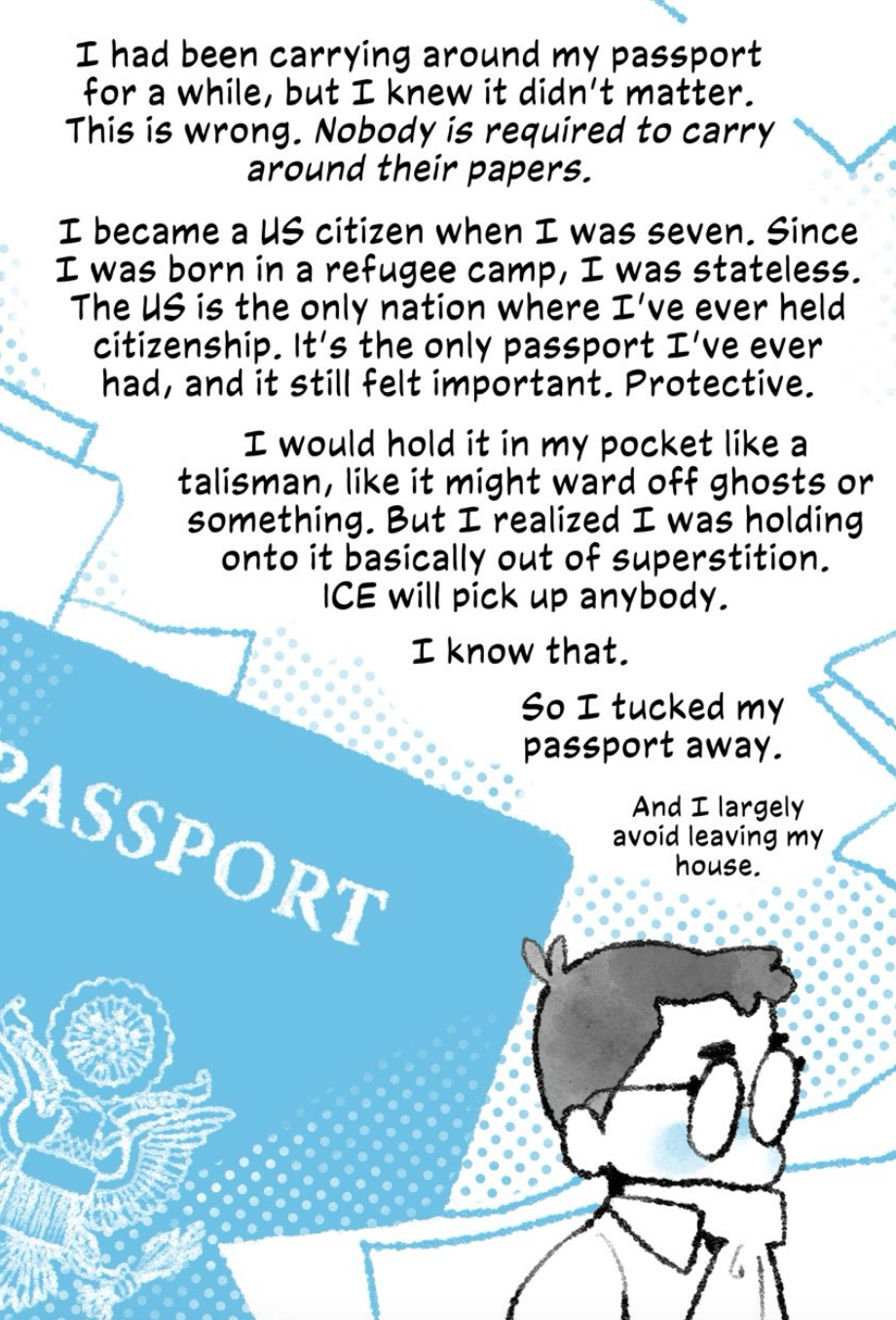 Nguyen, who lives near George Floyd Square in Minneapolis, wrote a comic documenting how since ICE descended on his city, he’s largely avoided leaving the house. “While I’m a citizen, I still cannot leave my house without risking a major disruption to my life,” says the author of The Magic Fish. “This is not a rhetorical problem to me. My art will not save me, but community might. And doing this work—connecting with other cartoonists and with readers in the area and around the world—is really only a tiny part of engaging with community. It’s a small part of a greater and more essential effort.” ⚫️
