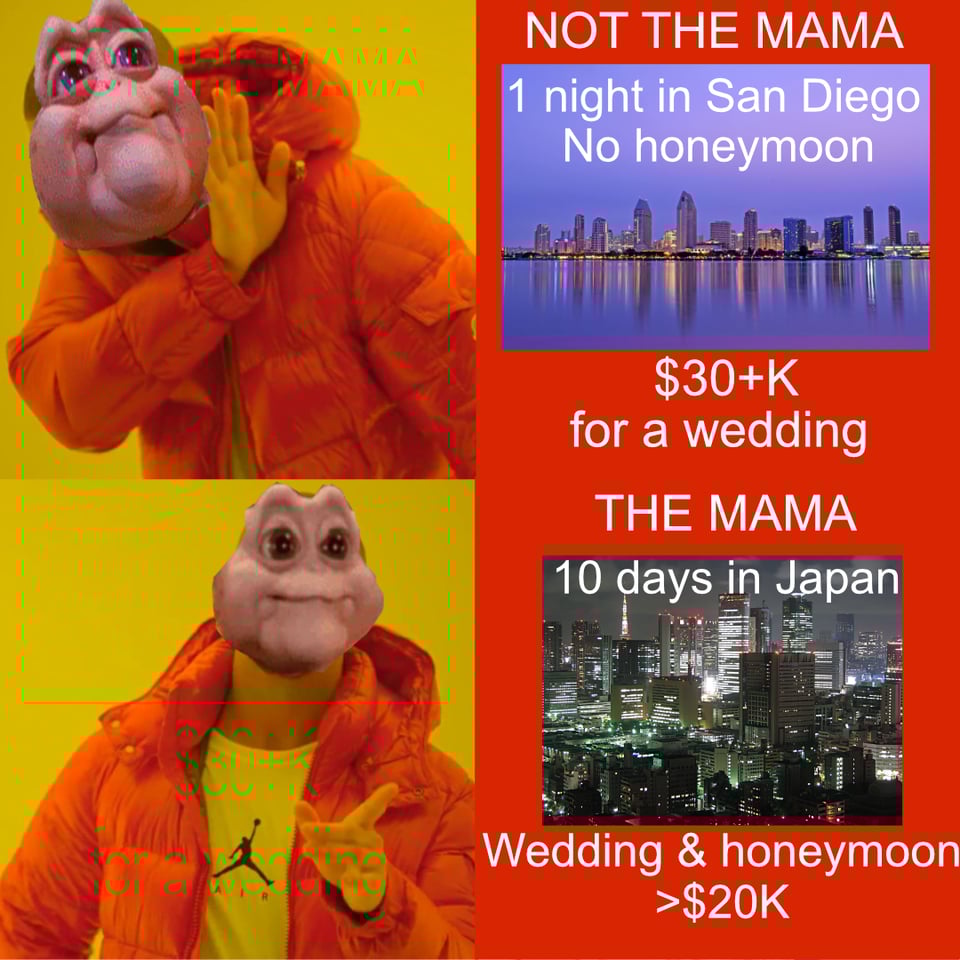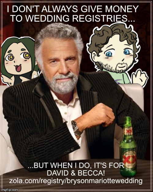 If you follow me on socials, you may have seen some of these already, but I decided to make a bunch of really dumb memes to promote our wedding/honeymoon registry. Enjoy!