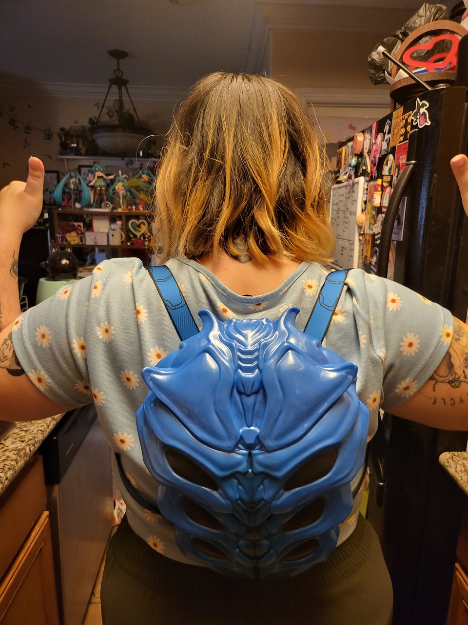 It was National Cinema Day yesterday, which is why Becca and I went to Blue Beetle ($4 tickets to the movies!). But they had to work, so I went and saw a second film, the 20th anniversary screening of Park Chan-wook's Oldboy. And the theater that was showing Oldboy had a special Cinema Day deal on the Blue Beetle backback popcorn bucket, so I did pick it up because that with a popcorn and a drink was still significantly cheaper than the bucket usually is by itself. So here's a photo of Becca modeling it.