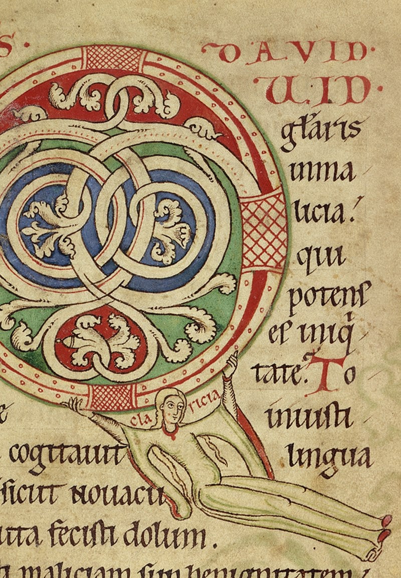 Claricia. From Claricia Psalter: Claricia swinging on the letter Q, 12th-13th century.