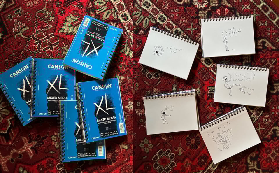 I have books filled with drawings. Some with just one single drawing on each page. During the pandemic I would wake up and draw a single drawing. Just something dumb, fun and quick. A picture and a little blurb. It was a silly abstract idea I don’t know why I did. It really seems I just did it to slowly kill the planet with my silliness.