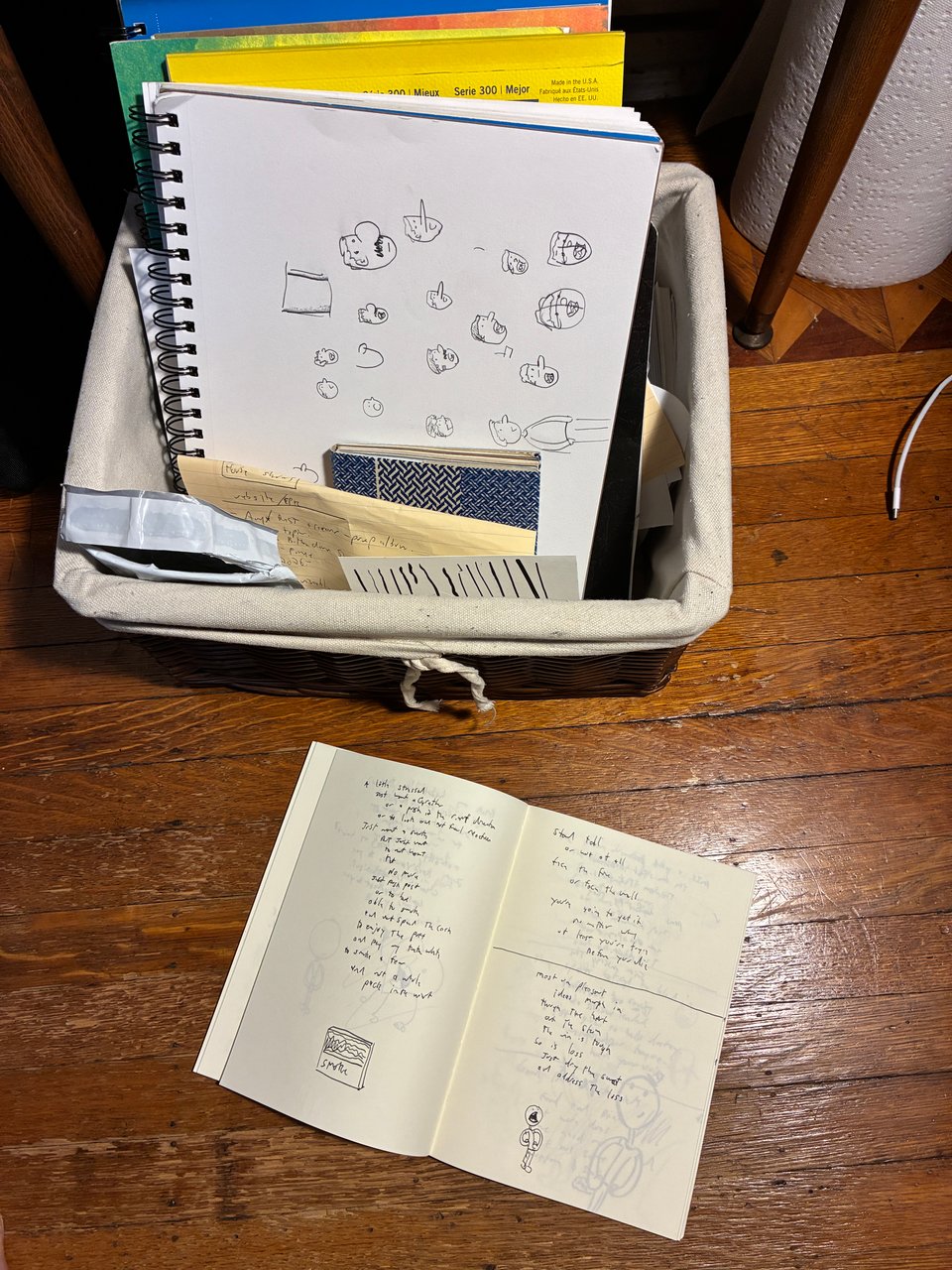 Sure, sometimes I might peak at a previous days jot down. And lots of times I use the pages to write other zany ideas. But there’s this odd thing in me that just hordes these ideas of mine. Maybe hoping that when I’m old and out of ideas I can revisit them and find that perfect nugget of my youth. I recently for this very newsletter looked back into an old notebook and what I found from maybe about 5 years ago was the nugget of my street fringe show “Everything is a Condo” So what it means is, I’m just repeating myself in these books. Letting the ideas permeate.