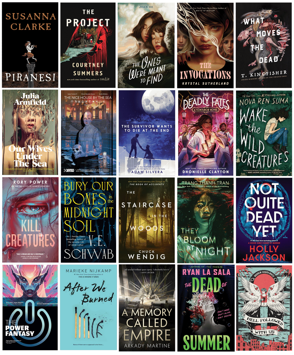 Piranesi, by Susanna Clarke (did you know she has Chronic Fatigue Syndrome? Here’s an interview she did about that!); The Project, by Courtney Summers; The Ones We’re Meant to Find, by Joan He; The Invocations, by Krystal Sutherland; What Moves the Dead, by T. Kingfisher; Our Wives Under the Sea, by Julia Armfield; The Nice House by the Sea Vol 1, by James Tynion IV, Álvaro Martinez Bueno, and Jordie Bellaire; The Survivor Wants to Die at the End, by Adam Silvera; The Deadly Fates, by Dhonielle Clayton; Wake the Wild Creatures, by Nova Ren Suma; Kill Creatures, by Rory Power; Bury Our Bones in the Midnight Soil, by V.E. Schwab; The Staircase in the Woods, by Chuck Wendig; They Bloom at Night, by Trang Thanh Tran; Not Quite Dead Yet, by Holly Jackson; The Power Fantasy Vol 2, by Kieron Gillen, Caspar Wijngaard, and Clayton Cowles; After We Burned, by Marieke Nijkamp; A Memory Called Empire, by Arkady Martine; The Dead of Summer, by Ryan La Sala; Hell Followed With Us, by Andrew Joseph White.