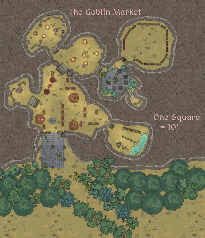 In creative writing classes, one of the best pieces of advice is "learn the rules before you break them," and I applied that philosophy to how Champions of the Goblin Market. I did all I could to stay true to funnel structure in how the map was designed, how the backstory had to be relevant, and how encounters should balance "traps" or puzzles with combat. That's just good module writing, in my opinion. I mentioned that I wanted to question characters' ethics, throw in some creative and light-hearted elements, and have a strong, melancholic emotional core; a tale of defiant hope against all odds, even defeat. And I certainly wanted to make the feel of folklore come to life in the descriptive text and the imagery, with a lyrical prose style that has a touch of pulp to it, and art that had a "painted" look to it. I peppered it with Easter eggs, too. There was a necessary nod to Christina Rossetti, another hat tip to Geoffrey Chaucer that alludes to the sequel, and a few more sly mentions of poets. Plus, I called on some folk legends about goblins, involving fruit, shoes and charms. Overall, I wanted it to be steeped in the lore that inspired it.