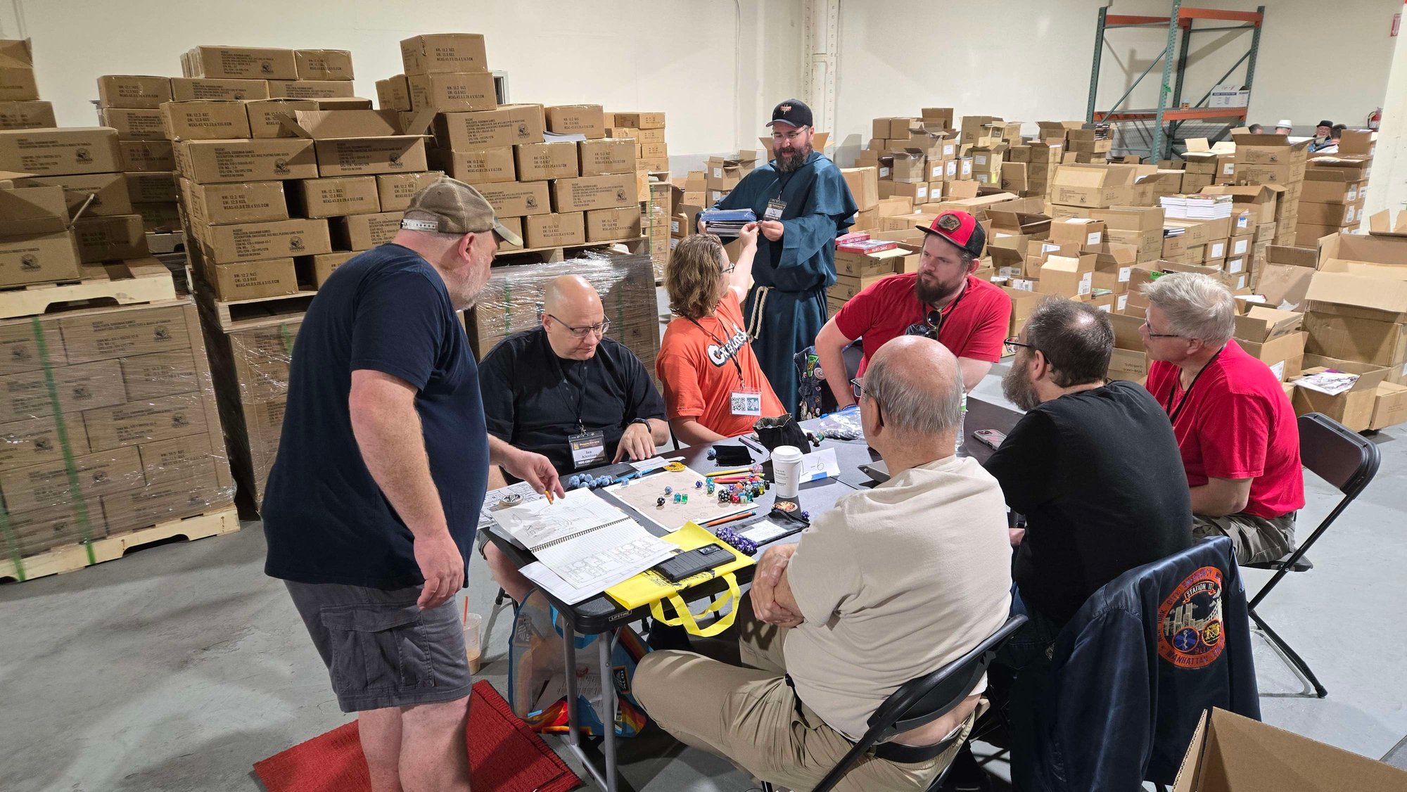 After about 5 hours of sleep, we woke up to make a quick breakfast and left for the Goodman Games warehouse. A chaos lord helped us find parking. My co-host on Rules Against Written manned the registration booth and got us all our badges. Soon enough, it was time for the morning games. I played in The 7th Doom Quest of Delial Kroom, which was run by both Doug Kovacs and Harley Stroh. The players at each table had split-soul counterparts at the other table. When one died, they both switched tables. This quickly became a way to pass information back and forth so we could make plans.
