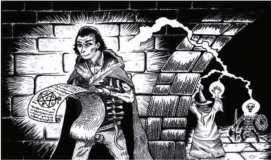The Scholar is a much simpler class; it follows the hybrid class design of Graves & Groves to make characters that can function as wizard or thief, though obviously not as well as their respective full classes. They primarily cast through scrolls and can produce them much easier and cheaper than a regular wizard, though at the cost of flexibility; only they can cast these cheap scrolls. I wanted to play with alignment based design, like the core Thief, but I still appreciate characters having a choice of their skill preferences, so you can expect fundamental differences to their casting based on alignment. It was fun to write and it makes characters feel very different. Chaotic Scholars are very reminiscent of magical tricksters who focus on thievery and theft of magic, while neutral and lawful Scholars can often feel like adventuring librarians or learned jacks of all trades, though they are far from being a master of any.