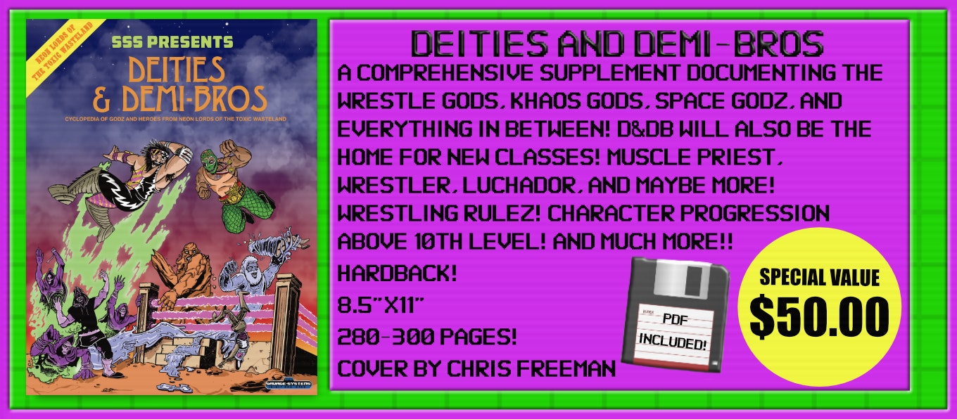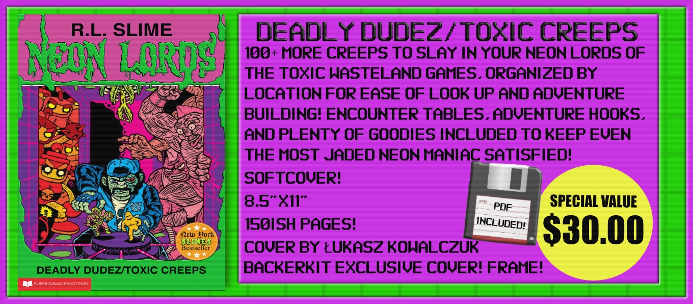 Neon Lords of the Toxic Wasteland is a radical game. Using BX as its rules basis, its like playing a post-apocalyptic version of your favorite Saturday morning cartoons. It’s a favorite that I’ve covered before on this post. And right now its having a big, big Backerkit campaign to fund the printing of two new big books: Deities and Demi-Bros & Deadly Dudez/Toxic Creeps. Keep on reading and the Neon Lord himself, Brian Shutter, will give you the skinny on what he’s up to!