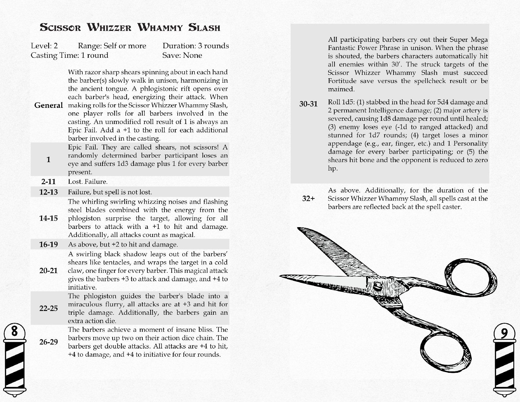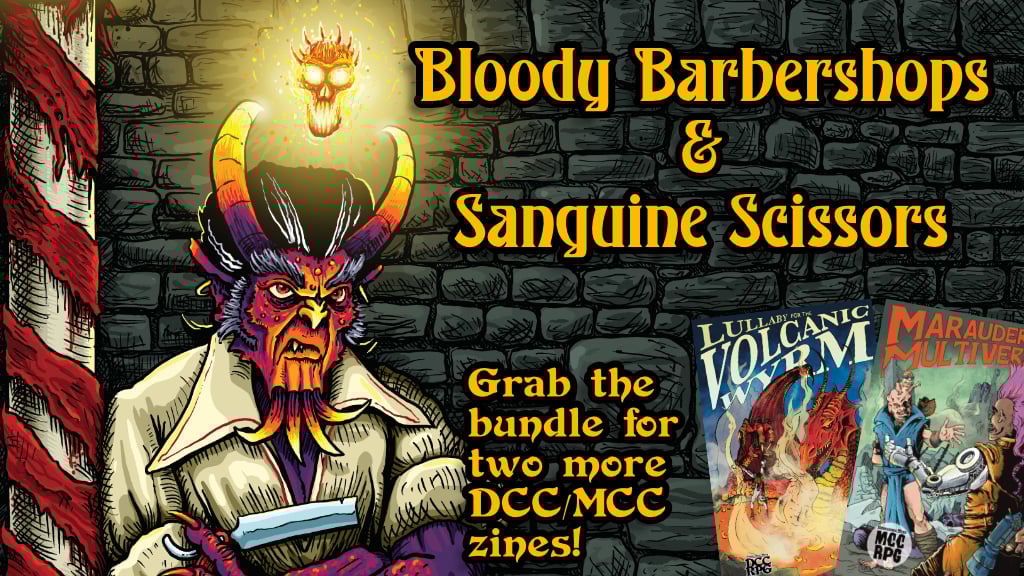 Bloody Barbershops & Sanguine Scissors is a zine for barbers and fans of barbering. Come for the new PC class: the Barber! And stay new new magic items, spells, monsters, and level-0 funnel adventure: The Demon Barber’s Phrontistery! The Barber class takes inspiration from the days of the historical “surgeon-barber” but also from more whimsical barbershop quartets. PCs will be able to slice, dice and amputate while also creating a debilitating four-part harmony. The new spell Imbue Elixir will also allow barbers to create perfumes, tonics, oils, creams, and waxes that beautiful hair (including magical mustaches) and grant magical effects.