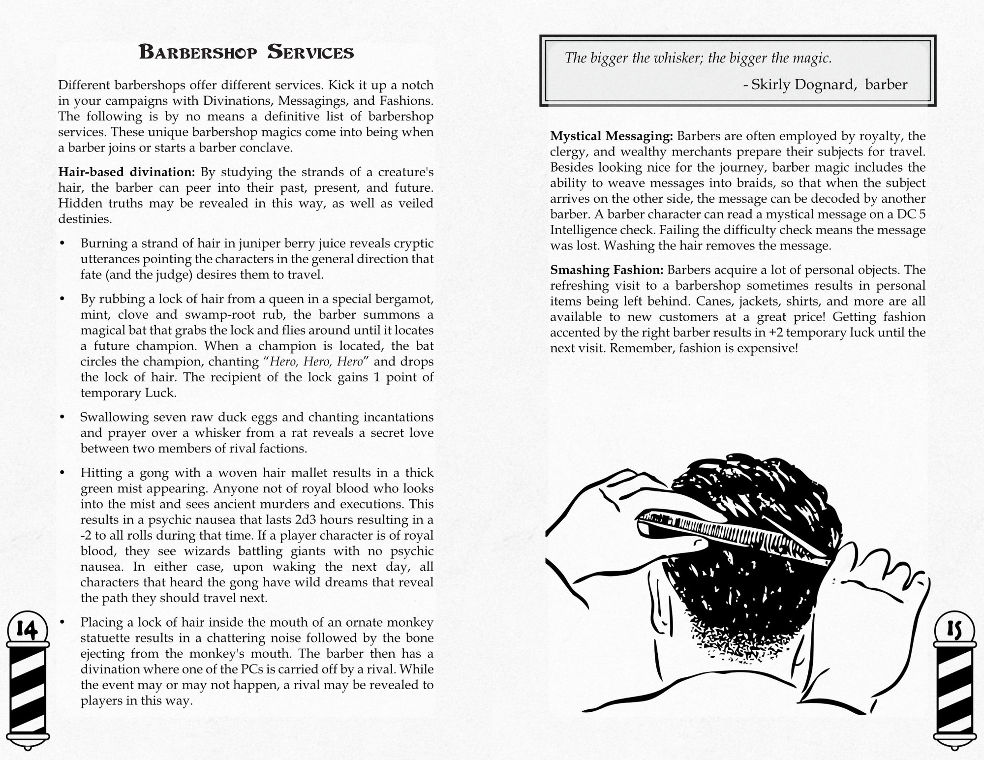 Pretty much the entire zine seems to be a parody and jest towards the art of barbering. My favorite is the Barbershop Pets. So, by local law, dogs are not allowed in barbershops. Well, Jumping Roo an a pogo stick, if we don’t have the most amazing dogs visiting our barbershop pretty much every day! The barbershop shares a parking with the veterinarian next door, everyone in town with a dog stops in the barbershop to say hello. So that had to do something with pets and that awkward cognitive dissonance they bring to my world. There is a great deal of irony about barbers being central to any magical universe, in the same way a gong farmer becomes a heroic adventurer. So in the fantasy world, we get to take a local gong farmer and elevate them to barber. In real life, barbering is pretty routine. In Punjar, when someone visits the barbershop, it is the start of an adventure!