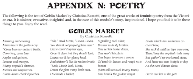 Yes, Pilgrims of the Goblin Road and Champions of the Goblin Market both have poems and recipes in them. I love both poetry and cooking, and wanted to share them in a way that enhances the players’ experience. The lyricism of language lends a magical quality to the narrative and serves the education that I mentioned before. The element of food can bring a tangibility to experiencing a campaign setting.