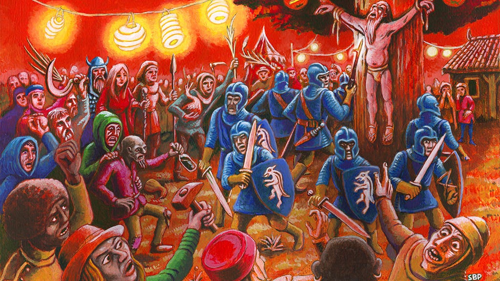 Glad you asked! One of the elements of all TTRPGs, but especially DCC, that often plays on my mind is how to structure a “boss fight.” So I went about it a variety of ways: Foremost, I have five of the Boss Fights converging on the town center, getting stronger as they go in many instances. The PCs decide who to engage first, and where and how, so there’s an element of strategy involved.