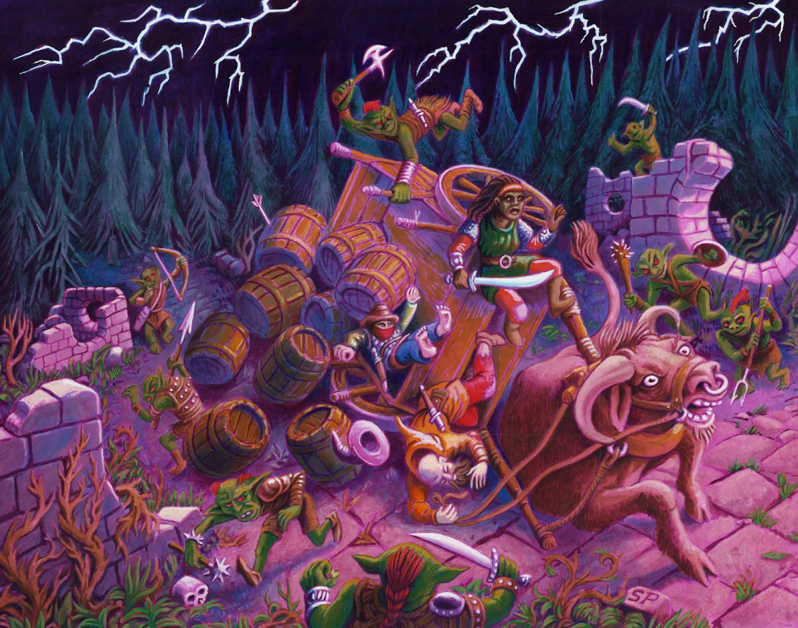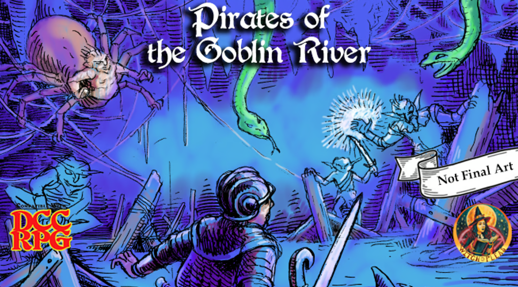 Pirates of the Goblin River sews together centuries of seafaring tales and tropes into a high-action melange of mystery, mayhem, and melee combat. It shows that pirate tales aren't just set in the Caribbean, but have a continuity that extends back through the Vikings of Beowulf's time and into the era when Odysseus was helping raid Troy. It does so by allusions to these works and by featuring tropes, such as sirens and cave battles and tavern brawls, that echo through those tales. And like those tales, it's packed with excitement, immediately plunging the players into a savage fight to the death, then drawing them along plotlines of revenge, brutal betrayal, and rampant greed. We also included opportunities for players to swing on rigging ropes and chandeliers, swim shark-infested waters, and solve musical puzzles like in the modern pirate classic, Goonies. In short, we packed together highlights from a few thousand years of pirate stories and turned the intensity up to 11, as befits a Dungeon Crawl Classics game.