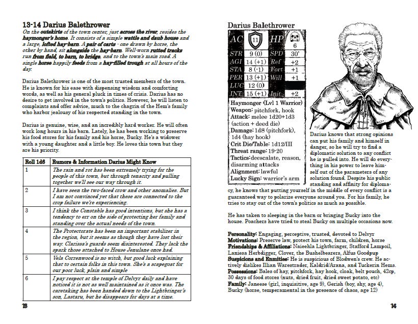 Stennard really took on a life of its own. When I wrote my first adventure, The Precipice of Corruption, I threw out some syllables that sounded good together in the intro and ended up with “Stennard.” When my first group of players wanted to interact with the town, I drew a map, rolled up some 0-levels to occupy it, and that felt like enough. And then it wasn't enough. LOL. Each time I ran Precipice in the wild, or started another campaign, the town evolved, characters stuck, and even the map changed shape. It started to feel like a living, breathing place. The more that it felt that way, the harder I leaned into it. Even when I pitched the original zine to Joseph Goodman as my T1 The Village of Hommlet, I didn't know how immersive the end result would be. Maybe I'm biased because I've lived with it in my head for so long, but I tried to capture that feel while making it extremely functional at the table.