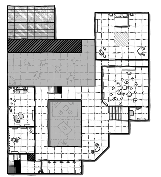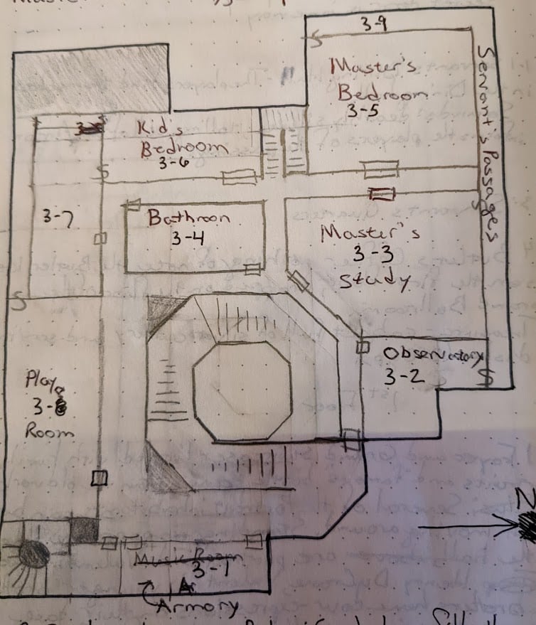So here's a few photos from the second floor. The first image is from November 2022 (marked as 3 because the basement was initially keyed as 1) and you can see some rooms, a bunch of secret passages and a bathroom right over the grand ballroom, not much of a ballroom if it's only 12ft tall or so. The second image is the un-keyed map from the artist Helicity Boson. You can see how I changed the rooms around in some cases, and tried to keep that "blueprint" feel, you can see where Helicity had some of the previous floor below it visible, which I think helps make the map fun for players and Judges alike.