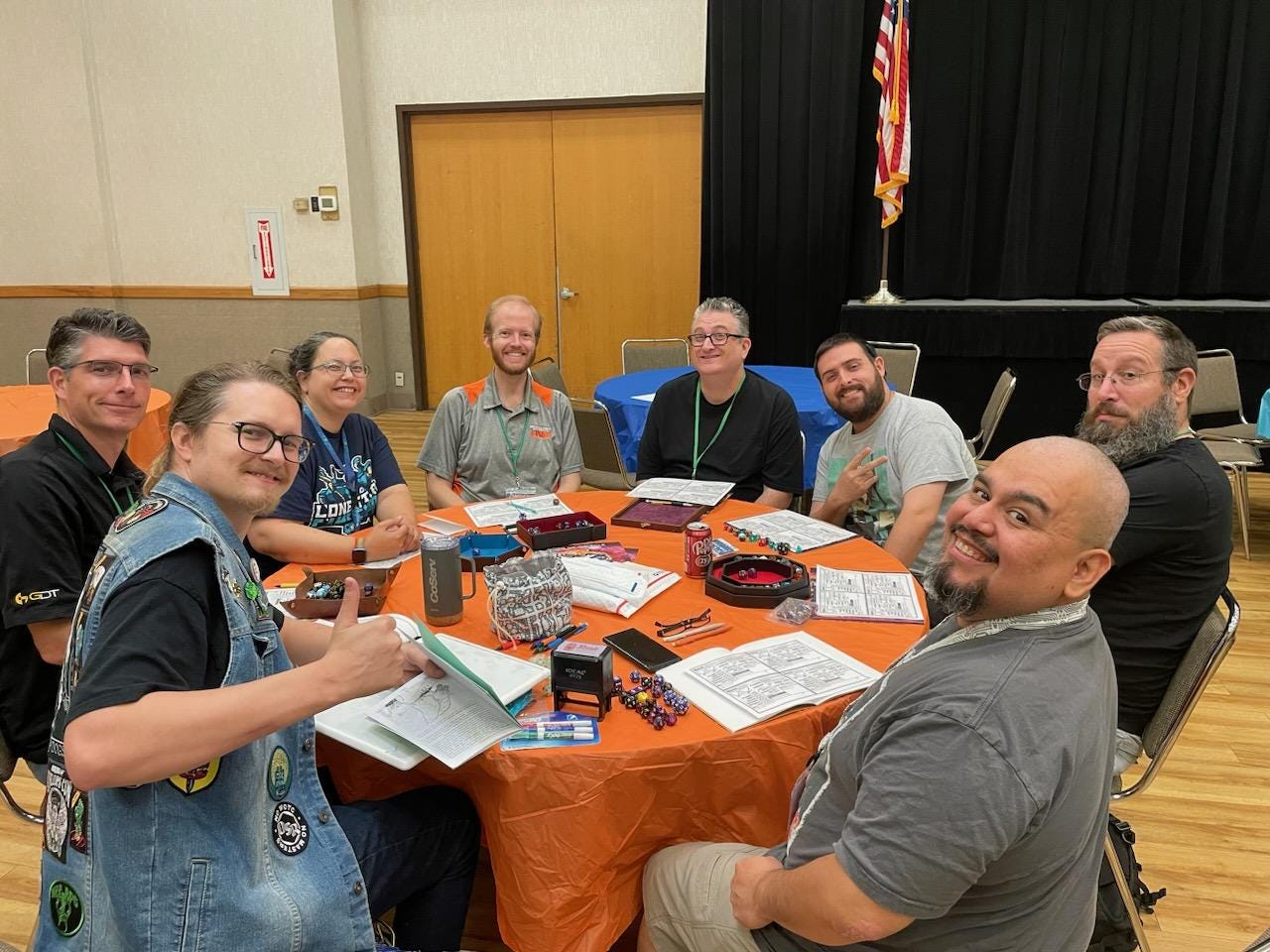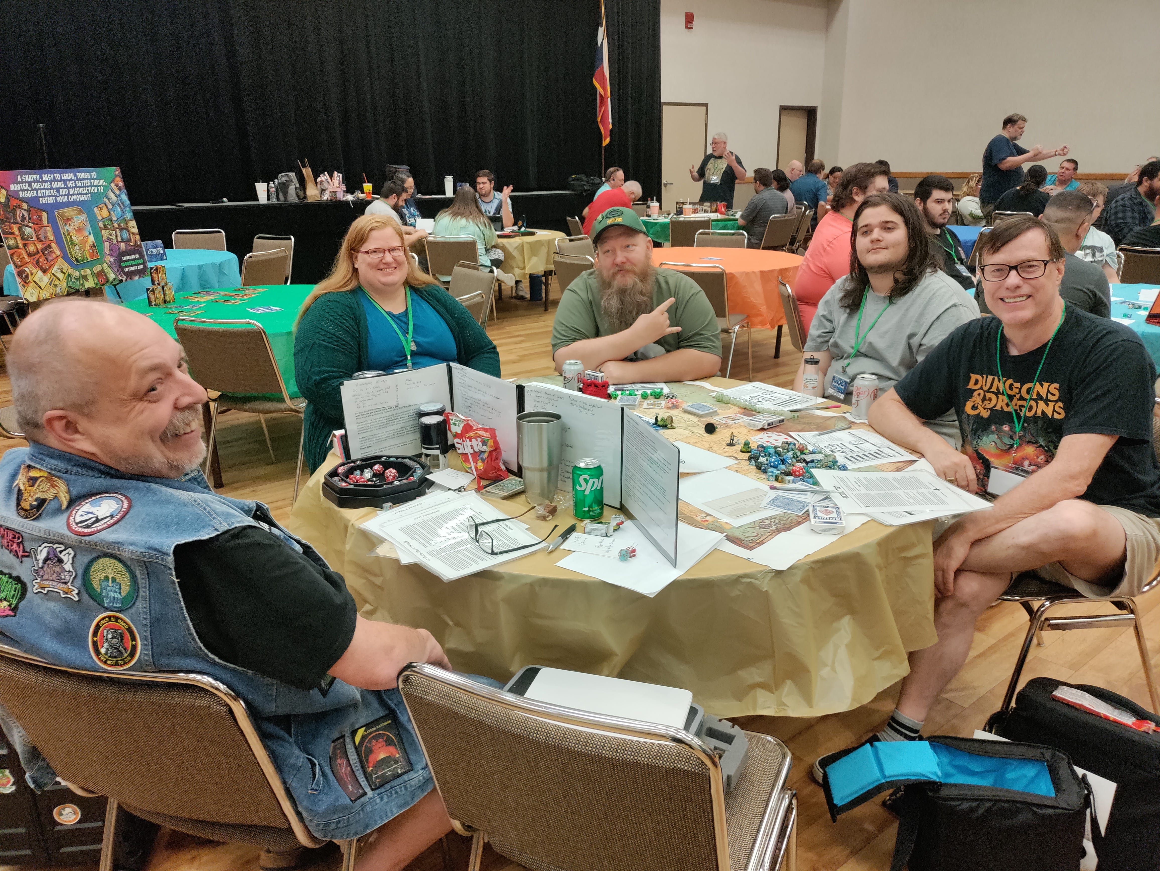 Plus, I got to chat with so many awesome people. I met the father of a kid who played in one of my games last year. I gave that kid a copy of the Quickstart Guide one year ago and he told me that he was gonna run Portal for his friends. These days, he’s the regular DCC judge for his friends, older brother, and his dad!