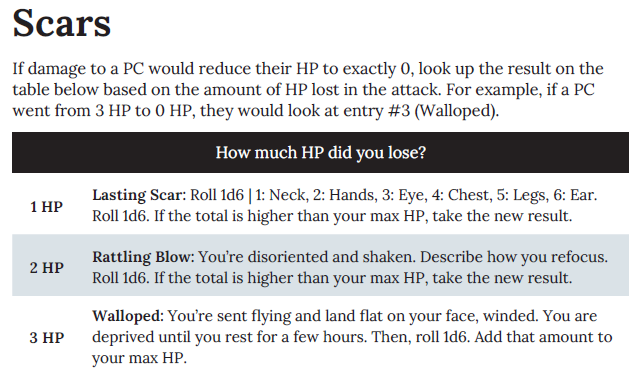 Electric Bastionland (← free link) and some other ItO inspired games such as Cairn (← free link), offer little in the way of mechanical character progression. Most progress comes from collecting useful gear. Instead, these games offer "scars" or the same thing but with a different name. When a character drops to exactly zero hp and doesn't die, they get a permanent scar. These scars increase hp or an ability score. Depending on the game it may be more natural or supernatural. But it should always be interesting.