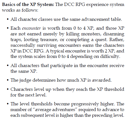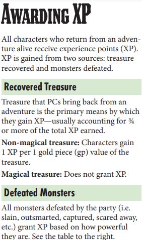 However, I would be remiss in my duties unless I mentioned that you need not kill for gold, as the act of killing does not gain you anything. It is the plunder of treasure that nets XP. PCs often become liars and sneak-thieves as often as they do murderhobos. Similarly, a setting full of chaos-serving pig-faced orcs is different than one of advanced space faring culture. So this method of character progression does inform the types of games that are played, but it does not have a monopoly of influence.