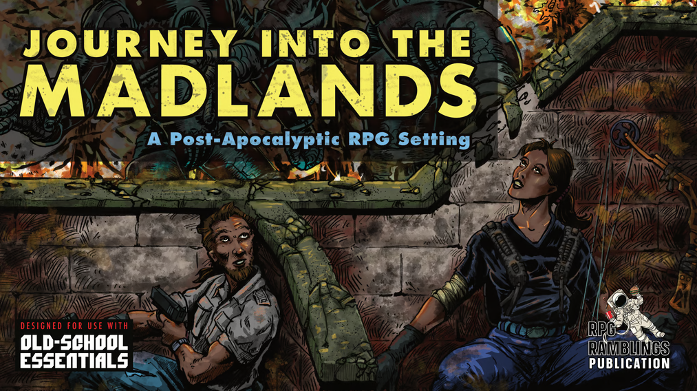 Journey Into The Madlands is a post-apoc setting book for Old School Essentials. The book is 8.5"x11" softcover with a black & white interior and will land at around 52 pages. These pages will contain: