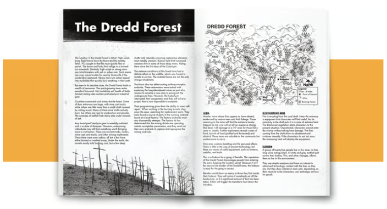 Later, LIKE A YEAR LATER, he contacted me asking if I’d like to write the Dredd Forest, which became the region that the factory is placed within. He’d written a couple brief paragraphs describing what he thought it’d be like. I took a few days to brainstorm some ideas and wrote down different elements that I thought would be fun to include. Then I narrowed those down to what I’d prefer to write about and what I thought might best fit with the setting’s tone. Then we had a video call and discussed the ideas to further narrow down the design goal.
