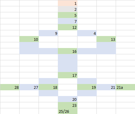The first step was identifying which rooms felt important within the context of the adventure. This was pure preference, but I tried to rearrange them so in a way that would make sense and still be true to the adventure. I used Google Sheets to organize this. The green cells are “key rooms” and the blue cells are “hallway” rooms, and the light red cell is where the PCs begin the adventure. I arrange them so that the players could choose different pathways and I didn’t make it a railroad. I ended up with three possible paths to escape the underworld.